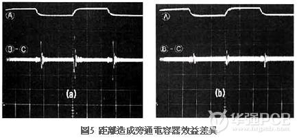 圖5是距離與旁通電容器的互動特性測試結果,圖5(a)的旁通電容器與IC的距離為10cm,圖5(b)為3cm,兩者其它條件完全相同,不過(a)與(b)的效果卻截然不同,距離為10cm時旁通電容器幾乎未發揮任何作用。