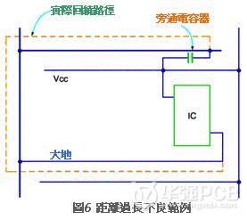 圖6的旁通電容器外觀上看似非常靠近IC,實際卻是典型的設計不當范例。旁通電容器的效果,基本上取決于電源-大地-圖案三者之間的回繞方式,雖然旁通電容器的效果非常大,不過布線的阻抗也非常重要,因此設計上通常會使用非常粗大的圖案(圖7)。