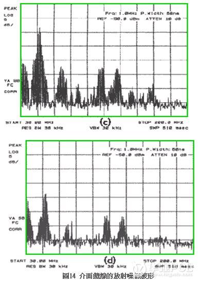 圖13(b)仍舊殘留若干連接;圖13(d)出現癱陷(sag),圖中水平部位應該呈平整狀,實際上卻是急遽下降之后略為提高,至于癱陷則是電感值過大造成的特殊現象。圖13(c)被認為最適宜的Ferrite beads。數字信號的場合,圖13(d)比較妥適,不過即使是圖13(d)的波形也不會引發誤動作。若與圖13(c)比較,信號的高頻成份反而大幅減少,其結果如圖14所示,來自信號信的放射噪訊亦隨著降低。