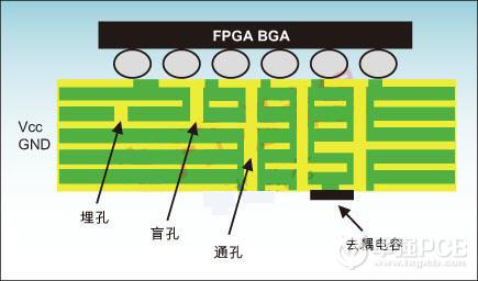 圖3-典型的PCB疊層和設計要素(注意BGA焊盤要偏離于過孔)。