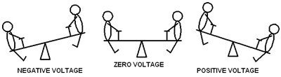 另一方面,一個差分信號作用在兩個導體上。信號值是兩個導體間的電壓差。盡管不是非常必要,這兩個電壓的平均值還是會經常保持一致。我們用一個方法對差分信號做一下比喻,差分信號就好比是蹺蹺板上的兩個人,當一個人被蹺上去的時候,另一個人被蹺下來了 - 但是他們的平均位置是不變的。繼續蹺蹺板的類推,正值可以表示左邊的人比右邊的人高,而負值表示右邊的人比左邊的人高。0 表示兩個人都是同一水平。