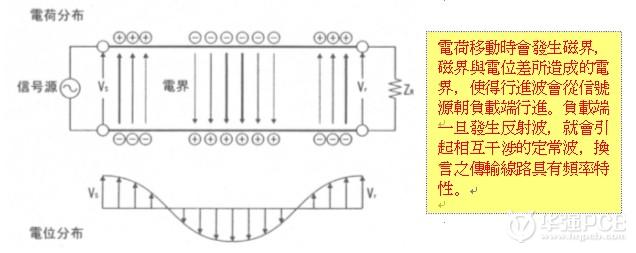 也就是說2Td是信號在傳輸線路往返的時間,如果2Td比數位信號站立時間tr更大時就會產生問題,此時會因反射出現over shoot與跳動(bouncing)現象,成為電路誤動作的因素之一。假設傳輸線路的長度為l時,信號延遲時間Td的關系可用下式表示: