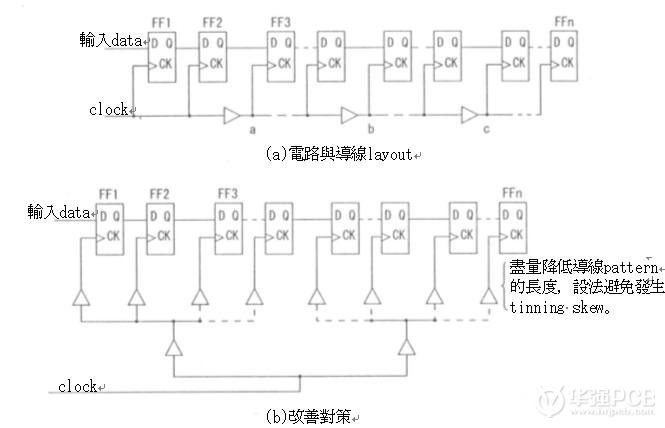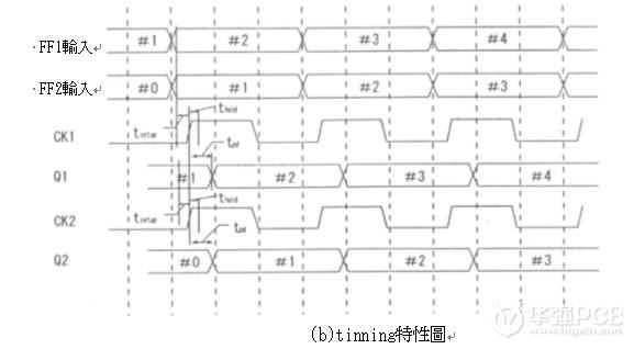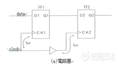 圖10(b)表示可忽略tinning偏差亦即tpd2-tpd1≈0,換言之從輸出端子祇輸出IC規格書標示的信號傳輸延遲時間內的延遲信號,實際上由于IC的延遲與pattern長度所造成的影響有大小區分,因而產生clock之間產生延遲時間差異,如果延遲時間差異過多時,會發生數據異?,F象,此時FF2的clock無法維持讀入的FF1輸出數據set up時間與hold時間,最后導致FF2的輸出變得非常不穩定。