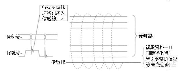 如圖12所示由于數據線(data line)產生的cross talk,使得噪訊滲入其它信號線,往往是造成電路誤動作的原因之一。數據線有復數個數據同步變化,所以電流變化相當大,如果噪訊滲入信號線就會造成重大影響。如果該信號線是同步化邏輯電路時,即使受到cross talk噪訊干擾,祇要同步化tinning的噪訊未滲入,也不會造成電路誤動作。相隔很近的信號線同步化對抑制噪訊也具有很好的效應。