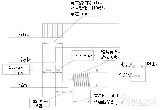 如圖8所示flip flop IC內具備set up time tsetup 與hold time thold 兩種規格,如果沒有充分的tinning裕度維持tsetup 與thold 時間,data一旦發生變化就無法確定是輸出的H或是L,形成不穩定狀態進而產生如圖8所示的須狀脈沖波形,往往還會有發振現象,這種狀態稱為「Metastable」。