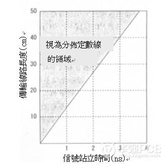 如果考慮IC/LSI的輸出入阻抗時,CMOS type的輸出阻抗一般為數十Ω,輸入阻抗則高達數百Ω,輸出阻抗值與傳輸線路的特性阻抗值非常近似(大約為50~100Ω),相較之下輸入阻抗值就非常大,為了有效抑制反射必需在收信端進行與終端相等的特性阻抗,不過基于耗電性等考慮上述方式并非上策,最好的方法是將傳輸線路當作集中定數線路處理,也就是說在無終端的前提下,利用傳輸線路的長度進行導線layout使信號能被順利傳送。傳輸線路使用集中定數線路或是分布定數線路,取決于數字信號的站立時間,圖6是信號的站立時間與輸線路長度的依存關系。