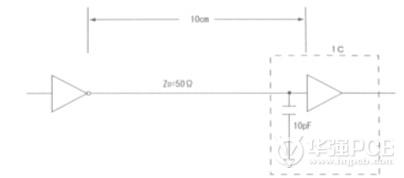 如圖7所示由micro strip line所構成的傳輸線路,從該線路(特性阻抗為)距離信號端100mm的位置具有10pF輸入負載容量時,試算它的傳輸延遲時間 "。