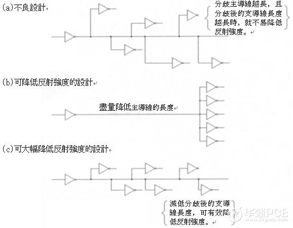 大部分的情況要設計理想狀態的傳輸線路幾乎是不可能,不過以理想狀態的概念設計電路卻非常重要。雖然實際誤差可透過檢討與調整補正,如果該誤差是因為設計不慎就存在的潛伏因子,最后則會面臨無法挽救的窘境。如圖5(a)分歧導線layout,信號波形很容易因反射波造成雜亂波,這意味著pattern導線長度的差異造成不整合進而引發雜亂波,會隨著分歧數量的變動與噪訊相互干擾更加速波形潰散。圖5(b)的導線雖然仍有反射波的問題,但不論是IC輸入端或是信號源的波形都很均勻,加上無位相差異因此反射波干涉造成的波形雜亂相對的大幅降低,這種情況就可利用dumping阻抗改善波形。