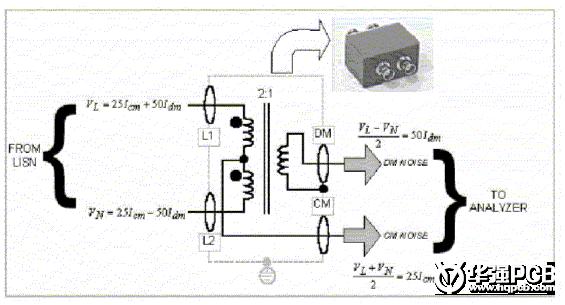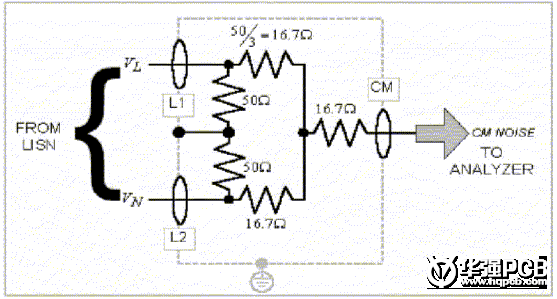 使用LISN后,就不需要分別測量CM和DM噪聲值,它們是利用上述的代數公式求得的。但有時還是需要各別測量CM和DM噪聲值,譬如:為了排除故障或診斷錯誤。幸好有一些聰明的方法可以達到各別測量的目的。我們舉兩個例子: