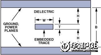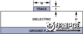 H表示從接地平面到信號印制線之間的距離,W表示印制線寬度,T表示印制線厚度;全部尺寸均以密耳(mils)(10-3英寸)為單位。εr表示PCB材料的介電常數。