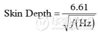 在高頻段,必須考慮一種稱為“趨膚效應”的現象。趨膚效應會引起電流流向導線的外表面——結果會使得導線的橫截面變窄,因此使直流(DC)電阻增大。雖然趨膚效應超出了本文討論的范圍,這里還是給出銅線中趨膚深度(Skin Depth)的一個很好的近似公式(以cm為單位):