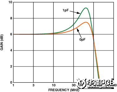 在高速電路中,很小的值就會影響電路的性能。有時候幾十個皮法(pF)的電容就足夠了。相關實例:如果在反相輸入端僅有1 pF的附加寄生電容,它在頻率域可以引起差不多2 dB的尖脈沖(見圖4)。如果寄生電容足夠大的話,它會引起電路的不穩(wěn)定和振蕩。