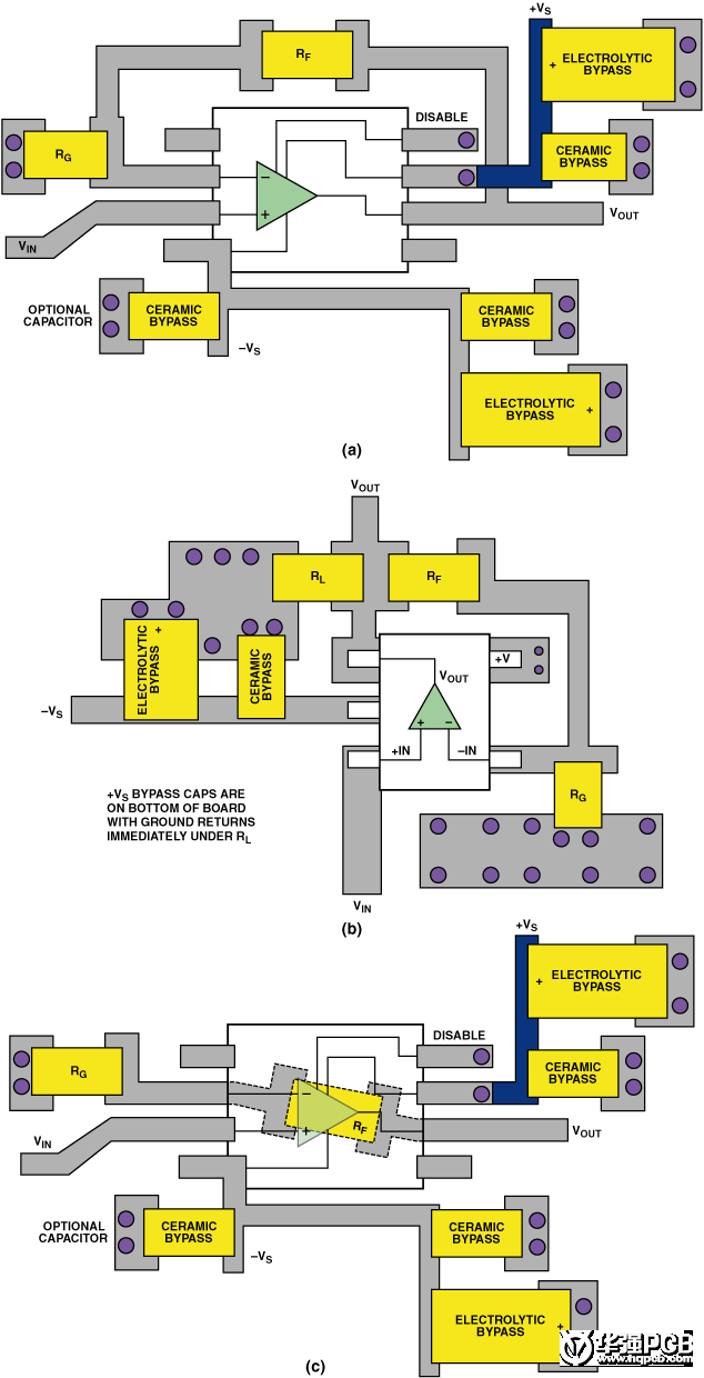 圖9. 同一運算放大器電路的布線區(qū)別。(a)SOIC封裝,(b)SOT-23封裝,(c)在PCB下面采用RF的SOIC封裝。