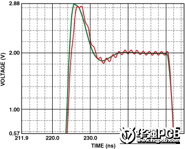 圖7中的振蕩示出了高速運算放大器同相輸入端長度為2.54 cm的印制線的影響。其等效寄生電感為29 nH(10-9H),足以造成持續(xù)的低壓振蕩,會持續(xù)到整個瞬態(tài)響應周期。圖7還示出了如何利用接地平面來減小寄生電感的影響。