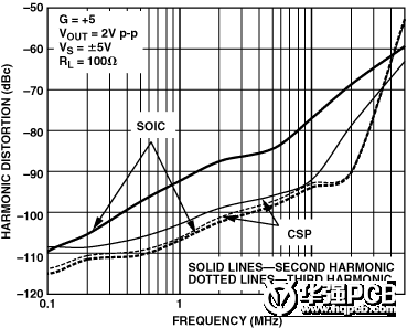 這種引腳排列還有一個好處就是降低了二次諧波失真。傳統運算放大器的引腳配置中引起二次諧波失真的一個原因是同相輸入和負電源引腳之間的耦合作用。LFCSP封裝的低失真引腳排列消除了這種耦合所以極大地降低了二次諧波失真;在有些情況下最多可降低14 dB。圖12示出了AD80992采用SOIC封裝和LFCSP封裝失真性能的差別。