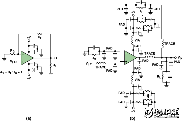 所謂寄生效應就是那些溜進你的PCB并在電路中大施破壞、頭痛令人、原因不明的小故障(按照字面意思)。它們就是滲入高速電路中隱藏的寄生電容和寄生電感。其中包括由封裝引腳和印制線過長形成的寄生電感;焊盤到地、焊盤到電源平面和焊盤到印制線之間形成的寄生電容;通孔之間的相互影響,以及許多其它可能的寄生效應。圖3(a)示出了一個典型的同相運算放大器原理圖。但是,如果考慮寄生效應的話,同樣的電路可能會變成圖3(b)那樣。