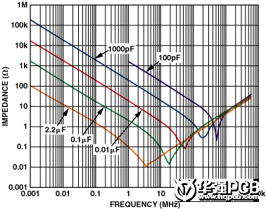 并聯不同的電容值的電容器有助于確保電源引腳在很寬的頻帶上只能看到很低的交流(AC)阻抗。這對于在運算放大器電源抑制比(PSR)衰減頻率處尤其重要。該電容器有助于補償放大器降低的PSR。在許多十倍頻程范圍內保持低阻抗的接地通路將有助于確保有害的噪聲不能進入運算放大器。圖1示出了采用多個并聯電容器的優(yōu)點。在低頻段,大的電容器提供低阻抗的接地通路。但是一旦頻率達到了它們自身的諧振頻率,電容器的容性就會減弱,并且逐漸呈現出感性。這就是為什么采用多個電容器是很重要的原因:當一個電容器的頻率響應開始下降時,另一個電容器的頻率響應開始其作用,所以能在許多十倍頻程范圍內保持很低的AC阻抗。